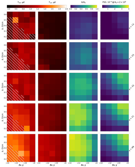 Results of MOT optimization process for several input parameters: magnetic field gradient (b, y-axis), frequency detuning (, x-axis), and total intensity of MOT beams in the units of saturation parameter (s, rows). Four columns represent four key parameters: two temperatures of atomic cloud ( along the horizontal plane and along the vertical direction), phase-space density (), and relative number of atoms (, where —the number of atoms in MOT after first stage cooling). Bowl-shaped cloud in the region of high detunings and low magnetic field gradient complicates temperature measurement in the horizontal plane. This area gives unreliable results for the horizontal temperature and is marked by the white lines crossing this area.