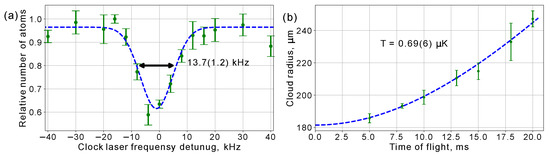 In order to independently measure low temperatures that we get in the vertical direction, we used clock line spectroscopy in a free space which we were able to do due to the experiments with optical clocks. After the capturing of atoms into the 3rd MOT (as in Figure 1b), we wait about for the magnetic fields to turn off. During that time, only -molasses work to restrain atomic cloud from expanding. After that, a -long clock pulse excites atoms along the vertical direction, and we detect the remaining atoms with the probe pulse and a CMOS-camera. The result of this experiment is presented in Figure 3a. The full width at half maximum of this line equals . In Figure 3b, we can see the result of the time-of-flight experiment, giving . This temperature corresponds to Doppler broadening of the clock transition linewidth. The similarity of the measured linewidth and the Doppler broadening assures correct measurements of the temperature of the atoms above and smallness of other residual broadenings, e.g., due to the Zeeman effect.