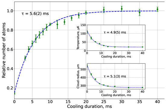 Number of atoms recaptured in broad MOT. Insets: temperature and cloud radius vs. 2nd-stage MOT cooling duration. Dashed lines represent the exponential function fitting, with the characteristic time of the recapturing process being ≈.