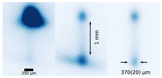 Parameters of the frequency-broadened 3rd stage MOT were adjusted so that the resulting atomic clouds contain an equal number of atoms (about 7% of the initial number of trapped atoms in each cloud) and are spaced several cloud diameters apart (Figure 5). The main characteristics of resulting atomic clouds are mostly determined by the optical lattice. Note that here the optical lattice was formed by a single reflecting mirror, unlike some of our previous works with enhancement cavity [21,25]. Final lifetimes and temperatures of clouds are similar, which enables space-resolved spectroscopy in two non-intersecting atomic clouds and is of interest for future works in this direction.