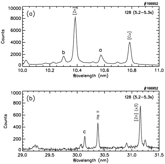 As mentioned in the previous papers [17,19,20,21], discrete spectra due mainly to ions with 4s or 4p outermost electrons are observed in high-temperature conditions (≃1–3 keV). In contrast, quasi-continuum features (the so-called unresolved transition array) of ions with 4d or 4f outermost electrons are observed in low-temperature conditions (below 1 keV). In this study, therefore, we analyzed a series of discrete spectra recorded in high-temperature conditions as they include isolated lines of Ga-like ions.