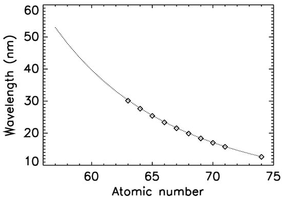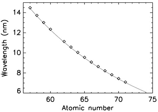 Similarly, the Z dependence of the transition wavelength for line c in Figure 1b is plotted in Figure 3. As is well known, this forbidden line corresponds to the M1 transition between the levels split by the spin–orbit interaction of the ground state configuration [Ar]3d4s4p. In general, the energy splitting due to the spin–orbit interaction rapidly increases with Z. For example, the Hamiltonian of the spin–orbit interaction for a hydrogen-like system is proportional to the fourth power of Z. Therefore, the wavelengths corresponding to this energy splitting are in the EUV range due to the large spin–orbit interaction for heavy ions. Again, the wavelengths measured in the LHD are indicated by diamonds, while a dotted line plots the calculated wavelength. Though the measured wavelengths for Z less than 63 are missing because of the limited wavelength range of the spectrometers used in this study, the calculated wavelength is given in the entire range of Z. We took the measured wavelength for tungsten (Z = 74) from our previous paper [2]. Though the wavelength of the M1 line for ytterbium (Z = 70) has also been reported recently in NIST EBIT [14], the M1 lines for the other elements (Z = 63–69 and 71) have been identified experimentally for the first time in this study. As shown in Figure 3, the experimental wavelengths of the M1 transition are in very good agreement with the calculated ones.
