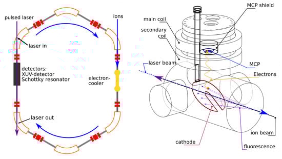 The ion beam was spatially overlapped with a counterpropagating laser beam on the same straight section where the XUV fluorescence detector is located. The revolution frequency of the ions was measured with a Schottky resonator at the 189th harmonic (∼244 MHz), while the emitted fluorescence photons were measured using the improved moveable in vacuo XUV detection system [8,9]. The principle of the XUV detector (shown in Figure 1 on the right) relies on the photoelectric effect and was successfully deployed in 2016 for laser spectroscopy of the transitions in stored and cooled relativistic C ions [8]. The XUV detector’s geometry is designed to collect forward emitted photons, taking into account the relativistic boost which causes the fluorescence photons to be emitted in a 1/ cone in the forward direction [10]. When fluorescence photons hit the (moveable) cathode, electrons are emitted and accelerated away from the cathode by an applied negative voltage. These electrons are then guided by an external (ex vacuo) magnetic field onto a microchannel plate (MCP) detector. This detection system was improved before the beamtime by installing a stepper motor-controlled linear drive for the motion of the cathode and by mounting an improved shielding to reduce the amount of stray laser light and unwanted charged particles arriving at the MCP. The stepper motor enables the operation of the detector with the cathode at intermediate positions between the parking position (where both signal and background rates are low) and the center of the beamline (where the opposite is the case). This therefore allows the optimization of the signal to background ratio. The new shielding reduces the background from the laser light and from charged particles created in the vicinity of the detector, e.g., by residual gas ionization or by an ion-getter pump located below the detection system. With the improved shielding, it was for the first time possible to run the detector and the ion-getter pump in parallel. While the beam-related background is still a problem, these changes were important steps toward a more sensitive detection system. The tunable pulsed laser system was a frequency quadrupled distributed feedback (DFB) laser with a final wavelength of 257 nm. Repetition rates between 1 and 10 MHz and pulse lengths between 166 and 735 ps could be achieved with an average effective UV power of 200 mW at 735 ps pulse length in the ESR. A wavelength of 257 nm corresponds to the Doppler corrected energy needed to excite the transition of the stored ions, which orbit the ESR at a velocity of 0.47 c, or equivalently, 122 MeV/u [7].
