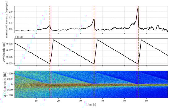 In order to set up the experiment, the electron cooler was turned on to decrease the longitudinal momentum spread of the ion beam. The laser wavelength was periodically varied from 257.238 nm to 257.235 nm in the form of a sawtooth function over a period of 20 s, as depicted in Figure 2. Here, all the data are plotted versus time, starting 5 s after the ion injection into the ESR. In panel 1, at the top, the XUV detector signal (fluorescence rate) is shown. In panel 2, in the middle, the laser wavelength is plotted, and in panel 3, at the bottom, the corresponding Schottky spectrum is shown. The recorded rate of the XUV detector was corrected for the background induced by stray laser photons and normalized to the ion beam (in order to correct for ion beam losses due to interactions with the residual gas in the beam pipe) and shows distinct peaks. The laser light is firstly red-detuned and becomes more and more resonant with the Doppler shifted transition wavelength of the ions during the scan, leading to an increase in fluorescence rate. In the Schottky spectrum, the effect of the laser is observable as a clear drop of intensity (blue) at a particular frequency. This drop is caused by the fact that the laser light pushes these ions to slightly lower velocities (i.e., towards the intense central trace in the Schottky spectrum), which can be seen as an increase in intensity (green/yellow) at that point. When the laser wavelength is scanned, a corresponding trace can clearly be seen. In Figure 2, three laser scans are shown. The signal-to-noise ratio of the peaks increases with each of the three scans because the combined effect of the laser scans and the electron cooler push the ions to the central velocity more quickly than they are lost due to charge exchange with the residual gas.