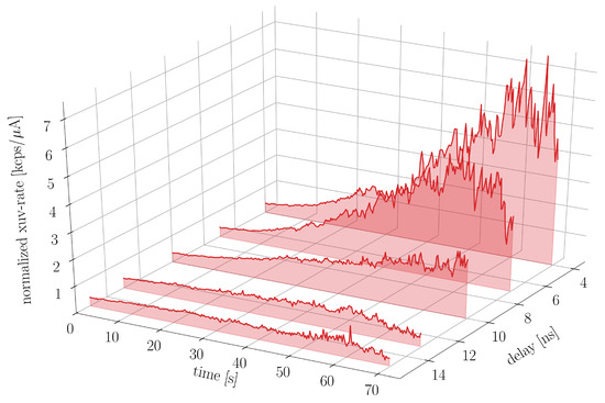 Due to the geometry of the XUV detector (see Figure 1, right), only photons emitted in front of the detector can directly hit the cathode and produce electrons which are guided through electromagnetic fields to the MCP detector [6,8]. For fluorescence detection, it is important to position the spatial overlap region of the laser pulses and the ion bunches within the detection zone. To vary and thus optimize the position of this overlap region, the laser wavelength was fixed at 257.235 nm (resonance condition), and laser pulses were delayed in small (ns) steps with respect to the ion bunches to spatially move the overlap region along the straight section of the ESR. For these measurements, the ion beam was bunched at h = 7, i.e., at a bunching frequency of 7 times the ion revolution frequency (1.29 MHz), which is ∼9 MHz. The control voltage of the bunching amplitude was low, i.e., below 250 mV. To synchronize the laser pulses with the ion bunches, the repetition rate of the pulsed laser system was equally set to the bunching frequency (∼9 MHz). Since the laser pulse generation could be set by a trigger, the laser pulses could also be delayed. A repetition rate of ∼9 MHz implies a time difference between successive pulses and bunches of about 110 ns. At a velocity of 0.47 c, it also takes about 110 ns for an ion bunch to cross the straight section of the ESR. These numbers imply that there must be a maximum in the fluorescence rate within a 110 ns range, and that this maximum occurs again 110 ns later. This has indeed been observed. The maximum was also quite narrow; delays of only a few ns caused clear changes in the fluorescence yield, as can be seen in Figure 3. This reflects the short detection zone and the short ion bunches (and laser pulses). Again, the data were corrected for the laser background and for the losses in the ion current, leading to an increasing signal-to-noise ratio over time.