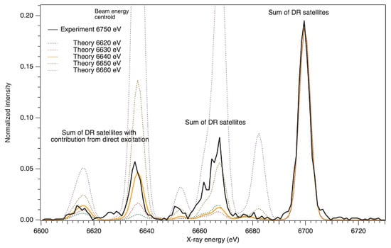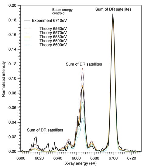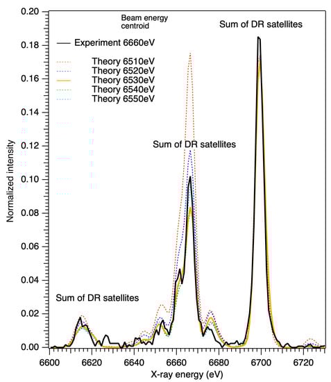 Figure 4 show the comparison of the normalized experimental and theoretically simulated spectra at nominal beam energies of 6660 eV, 6710 eV, and 6750 eV. Spectra were normalized to the strong feature in the spectra at around 6700 eV, minimizing the least-squares difference between the intensities of the experimental and theoretical data provided the best beam energy matches for the experimental spectra. At 6660 eV and 6710 eV nominal beam energies, this resulted in satisfactory agreements (