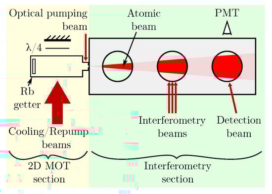 The design of our atom source resulted in a beam of atoms with fairly high divergence traveling along the central axis of the science chamber (or interferometry section), as depicted in Figure 1. The specifics and consequences of this design have been discussed in detail in our previous work [27,28] and in the next section, we only briefly discuss the salient points.