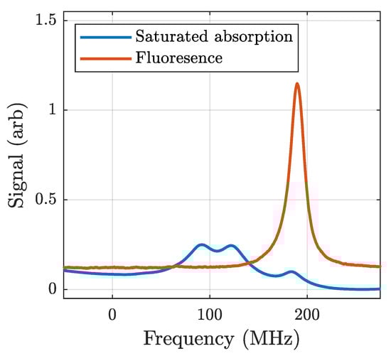 When the system parameters—namely, cooling laser power and detuning, repump power and detuning, and rubidium dispenser current—were optimized for the maximum flux, we found that the collected fluorescence from a scanning detection laser (nominally at right angles to the axis of the atomic beam) consisted of a large, narrow peak as well as a smaller, broader peak. The broader peak remained when the cooling or repump laser was blocked. Traces for the fluorescence with and without the cooling laser on are shown in Figure 6. We interpreted this broader peak to be “hot” (thermal) atoms escaping through the pinhole. The width of the broad peak was not consistent with a room-temperature Doppler profile, likely caused by velocity selection due to the geometry of the design. In order to avoid collecting fluorescence from hot atoms, we relied on the relatively low velocity of the cooled atoms. We sent the detection laser beam into the chamber at as steep an angle as the ∼1.5” clear aperture window would allow (∼). This caused the peak of the Doppler-broadened line to shift relative to the uncooled peak enough to spectrally resolve the line-shapes. Furthermore, as outlined below in Section 4.2, we dithered the detection laser frequency on the side of resonance for a lock-in detection technique. When we did so, we always set the central laser frequency to the low side of the resonances, further eliminating contamination of the signal from the unwanted fluorescence from the hot atoms.