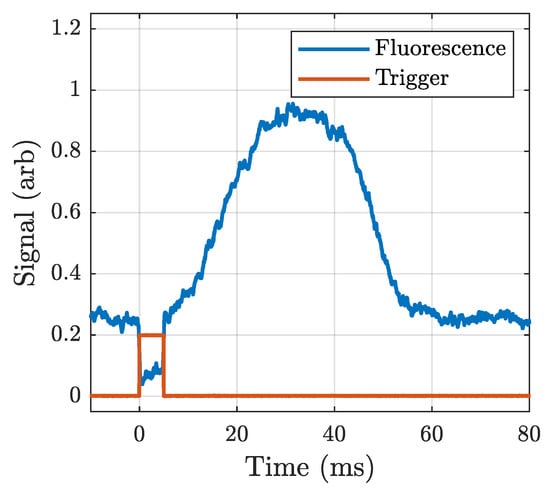 Our time-of-flight method started with a detection laser locked precisely on the transition. The AOM driving frequency was initially configured so that the optical pumping light was on-resonance with the transition and therefore, the atomic beam is deflected and the atoms were blocked by the aperture. We introduced a brief step function that produced a pulse of atoms making it through the aperture in the dark state which were subsequently repumped into the bright state for detection. Figure 3 depicts the result. The atomic beam was pulsed on at time ms for 5 ms. We see depicted a baseline of no signal increasing to a peak before falling away again. This signal represents a packet of atoms propagating down the vacuum chamber. The width of the peak is a consequence of the velocity spread of the atoms and the center of the peak gives the most probable velocity of the atoms. The known distance divided by the measured time resulted in an extracted velocity of m/s, consistent with our earlier measurement of ∼4 m/s, given the large errors associated with that measurement.