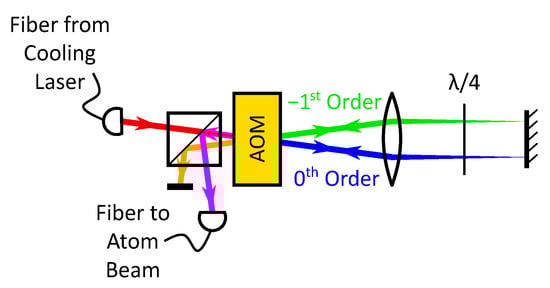 The optical setup used to create the light for optical pumping and atom beam switching was a variation of a standard double-pass AOM setup, and it is depicted in Figure 5. We started with light from our cooling laser, which was tuned ∼6 below the transition. On a first pass through the AOM, there were two primary output beams; the first was the -order beam that has picked up a negative frequency shift (equal to the AOM drive frequency ) and an angular deviation, and the second was the 0-order beam with no frequency or angular shift from the input. As with a normal double-pass setup, we arranged a lens at its focal length from the AOM to align these beams parallel to each other, allowing us to retroreflect both in a way that was insensitive to the angle/drive frequency. The retroreflection was also performed at one focal length from the lens, in the so-called cat’s eye configuration, which resulted in a collimated beam for a second pass through the AOM.