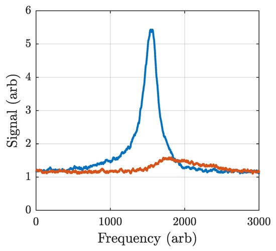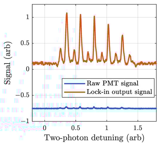 The lower blue trace in Figure 7 shows the result of a Raman spectrum measurement, as measured directly with the PMT. The measurement consisted of atoms emerging from the 2D-MOT source and being optically pumped into the ground state. The atoms passed through a single spatial mode of a laser field that consists of two frequencies nominally separated by the ground state splitting. The intensity of the laser fields and the spatial width of the laser fields were chosen to maximize the Raman peak of the clock transition. The atoms then traveled to the detection beam. The detection beam was shaped as described in Section 4.1. For normal operation of a lock-in amplifier, one might “chop” the detection laser (i.e., cycle the amplitude) and lock-in detect on the chopping frequency. However, as the scattering is partly caused by the detection laser itself, the detection laser scattering would also be amplified by the lock-in amplifier. Another normal mode of operation for the lock-in amplifier is to dither the frequency of the detection laser and lock-in detect on the dither frequency to create a line shape that is a derivative of a Lorentzian. We indeed dithered the detection laser frequency, but since this is not the parameter we are scanning in the experiment (which in this case is the two-photon detuning of the Raman fields), it resulted in a direct copy of the Raman signal (amplified and without the background) rather than a derivative. The detection laser was nominally locked to the low-frequency side of the peak of the transition. By frequency-modulating the detection laser, the fluorescence was amplitude-modulated but the background light was not amplitude-modulated (to first order). This enabled us to run the lock-in amplifier with an amplitude-modulated signal. Of course, there was additional (strong) background light from the Raman laser that reached the PMT as well. This light was not affected by the dithering of the frequency of the lock-in amplifier and so it was also filtered by the lock-in amplifier. Figure 7 (the upper red trace) shows the result of a measurement of the Raman signal under the same conditions as those for the blue trace, but using the lock-in amplifier.