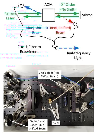 (Top) Depiction of the optics scheme used to create the two frequency-shifted Raman beams from a single laser. When the light from the Raman laser passes through the AOM, the 1st-order beam (red dotted arrow) is red-shifted by 1517.866 MHz. After retroreflection of the unshifted 0th-order beam, the 1st-order beam from the second pass (blue dashed arrow) is blue-shifted by 1517.866 MHz. These two beams are then combined via a 2-to-1 PM fiber and taken to the experiment (dashed and dotted beam at bottom of the diagram). (Bottom) Photo of the optics scheme used to create the two frequency-shifted Raman beams from a single laser.