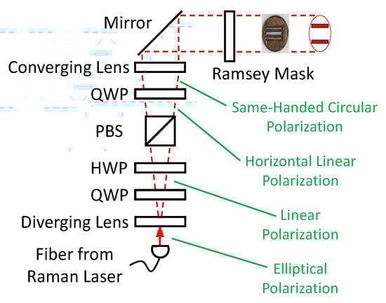 Depiction of the optics used to create the separate physical Raman beams from the single Raman laser. The beam size is manipulated so that a mask may be used to make the beams; as an example, this depiction shows a three-beam mask used for spin-echo interference. The polarization produced depends upon whether the configuration is Doppler-sensitive or not (this depiction shows same-handed circular polarization for a Doppler-free, co-propagating scheme).