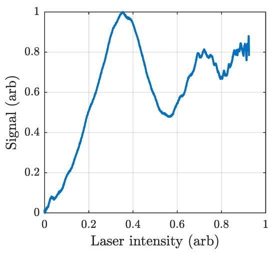 We evaluated the signal above background as a function of total Raman beam power by adjusting the current in the tapered amplifier. We expect the signal to increase up to a point before falling off again—this maximum is the -pulse condition. We set the magnetic field to a value that spectrally resolved the clock transition. We then scanned the Raman laser frequency over the clock transition frequency and recorded the amplitude of the resultant scan for a range of total Raman powers. This method has the advantage of not needing additional equipment, but the disadvantage of being both discrete in laser power and time-consuming. We performed a similar measurement in which we kept the two-photon Raman frequency fixed and scanned the Raman laser power. We added a low-frequency AOM, passed the Raman fields through it, then sent the 1st-order beam to the vacuum chamber. The scan of the optical power was not linear but this was accounted for by “picking off” a portion of the laser beam and monitoring the power with a photo-detector. The results of these measurements are plotted in Figure 11, they are similar to the modeling discussed in [36], and they show Rabi oscillations as the laser power increases above the -pulse condition. The dephasing is likely caused by three effects. As the power increases, so do any residual AC Stark shifts, although we minimized the shifts as much as possible. The changing AC Start shift will appear as an increased detuning for the higher power, causing a drop in the oscillation amplitude. Secondly, the effects of incoherent scattering caused by the fact that the Raman fields are not “infinitely” single-photon detuned increase with increasing power. Finally, the atomic beam is not mono-energetic: the atoms have differing speeds which translates to differing times in the atomic beam and thus, the measurement is an average over all possible velocity classes/transit times.