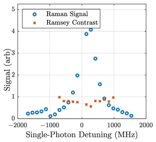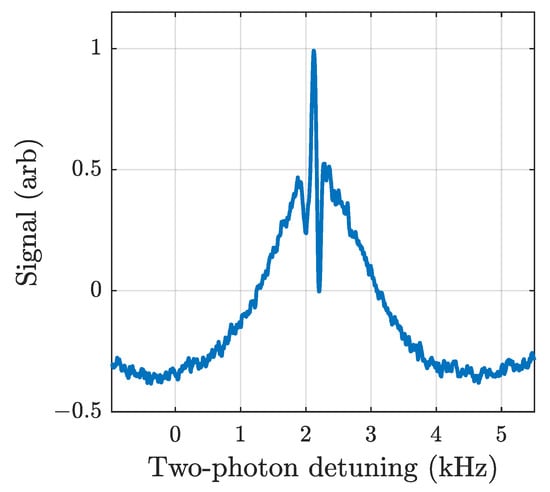 As shown in [37,38], Ramsey interference is a result of a pulse sequence. This is a useful intermediate step (en route to a full interferometer) as it represents the simplest form of atomic interference we can generate in the experiment. More importantly, it was crucial in that it demanded that all of our Raman settings were correct. We can only see it if the physical beams have acceptable coherence, geometry, and are truly providing the atoms with -pulses (up to Doppler averaging). Figure 13 shows a representative trace of an optimized Doppler-free Ramsey interference pattern and is one of the main results of this paper—the demonstration of Doppler-free Ramsey spectroscopy from atoms emitted from a continuously operating 2D-MOT with continuous Raman fields. Of note is the asymmetry in the fringes. This effect is present in all of our measurements of Ramsey interference. We suspect the asymmetry is a consequence of velocity averaging in the presence of AC Stark shifts, but we have not been able to confirm this as of yet via theory or experiment. This will be the subject of future work in the lab.