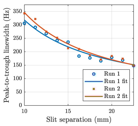 Experimentally measured Ramsey fringe linewidth (frequency difference between the central peak and the adjacent trough) as a function of physical beam spacing for two typical runs. The data points are fit to , where A = 2995 Hz * mm, d is the slit spacing, and c = 18.6 Hz for run 1, with A = 3516 Hz * mm and c = −5.30 Hz for run 2.