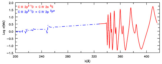 Illustration of the photoionization cross-section (in megabarn, with 1 Mb cm) of C iii 2pD. Ionization to the C iv ground state occurs via autoionizing levels such as C iii 2p 4d F. Shortward of ≈325 Å, photons have sufficient energy to ionize directly to C iv 2p P. The data were convolved with a Gaussian profile with a full width at half maximum of km s(i.e., km s). The photoionization cross-sections for C iii were computed by P. J. Storey (private communication). In other photoionization cross-sections the resonances are often much narrower than those shown here.
