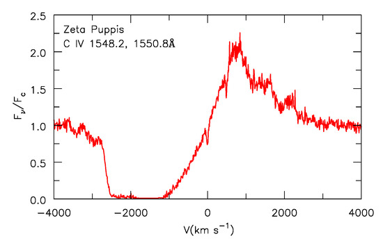 The C iv 1548.2, 1550.8 P Cygni profile in the O4 I(n)fp star Zeta Puppis. The x-axis was computed using where . The spectrum has been normalized by the continuum spectrum ()—i.e., a smooth curve drawn through spectral regions showing no evidence for bound–bound absorption or emission. Strong blue shifted absorption is seen, indicating an outflowing stellar wind with a terminal velocity () in excess of 2600 km s. The redshifted emission primarily arises from continuum photons that were emitted in other directions, absorbed by C iv, and subsequently scattered to the observer. The two narrow absorptions near 0 and 500 km s are due to absorption by C iv in the interstellar medium.