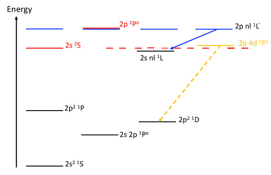 Consider for example C iii whose ground state is 2sS where we have omitted the complete inner shell for simplicity. The states contributing to HTDR are the Rydberg states of the form 2p nl that converge on the C iv state 2p 2Po (Figure 4). Such states can autoionize to give C iv 2s S or the 2p electron can radiatively decay giving rise to C iii 2s nl. At “low” densities the nl electron will decay to a lower level, producing a “real” recombination. Since the autoionization rates decay slowly with n, and since the 2p → 2s transition probability is approximately constant, high n values (e.g., up to n = 100) determine the net recombination rates. Such levels are not typically included in nLTE calculations. The process is further complicated because the autoionizing rates strongly depend on the angular momentum—low “l” states have much higher autoionization probabilities than do higher angular-momentum states [85,87].