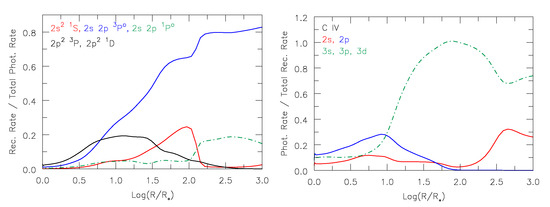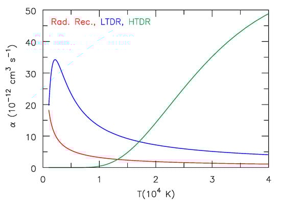 In Figure 5, the different recombination coefficients for C iii are plotted. The radiative recombination rate and the HTDR rate are from [83], while the LTDR rate is from [81]. The crucial importance of dielectronic recombination for C iii is clearly demonstrated by this figure.