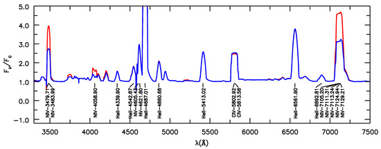 - Hillier, D.J. The formation of nitrogen and carbon emission lines in HD 50896 (WN5). Astrophys. J. 1988, 327, 822–839. [Google Scholar] [CrossRef]