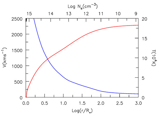 - Pauldrach, A.; Puls, J.; Kudritzki, R.P. Radiation-driven winds of hot luminous stars—Improvements of the theory and first results. Astron. Astrophys. 1986, 164, 86–100. [Google Scholar]