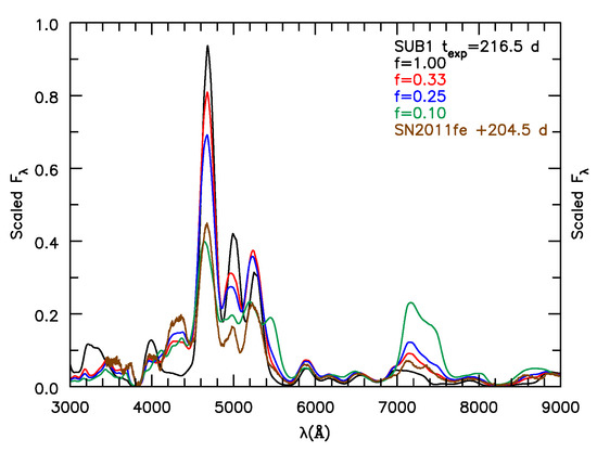 - Wilk, K.D.; Hillier, D.J.; Dessart, L. Understanding nebular spectra of Type Ia supernovae. Mon. Not. R. Astron. Soc. 2020, 494, 2221–2235. [Google Scholar] [CrossRef]