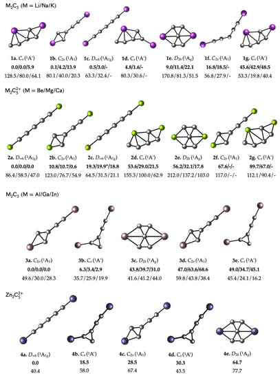To answer this question, we have explored the potential energy surface of the combinations of interest using the constraints specified in the computational details. The putative global minima and other relevant minima are shown in Figure 2. It should be noted that the lowest energy structure for neutral systems is in a singlet state, not for ionic systems where the D∞h triplet is more stable. However, the phC is only minimal in the singlet state. As can be seen, the phC structure does not correspond to the putative global minimum in any of the cases, being the closest isomer to the putative global minimum in the M2C5 combinations (M = Li-K; Al-In). The Li2C5 and Na2C5 phC structures have the closest energy to their corresponding putative global minimum, located above 9.0 and 11.4 kcal·mol–1, respectively. This agrees with previous claims that the D2h Li2C5 cluster would be the most viable for experimental identification [63].