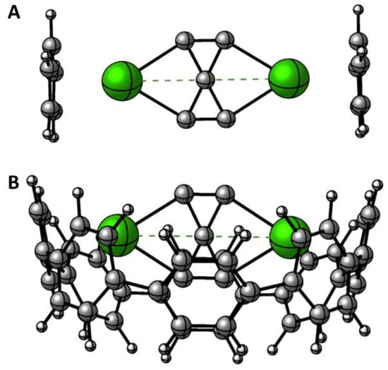 The PES of the Li2C5 system was explored using the AUTOMATON program [28,29]; in the search process, optimizations were performed at the PBE0 [30] /SDDAll [31,32,33,34,35] level. Then, the lowest energy minima were reoptimized at the ωb97XD [36] /def2-TZVP [37] level (both in singlet and triplet states). For the other systems C5M2 (M = Na, K, Al-In) and C5M2+2 (Be-Ca, Zn), the lowest energy minima obtained for C5Li2, were used as starting structures, then optimized at the PBE0/SDDAll level and reoptimized at the ωb97XD/def2-TZVP level, the latter being the level considered for the discussion of relative energies. The lowest energy isomers confined between aromatic ligands, benzene (C6H6) and cyclopentadienyl anion (C5H5−) were also optimized for the neutral and dicationic cases, respectively. Finally, the phC isomer of Ca2C52+ was optimized inside an 8-ring cycloparaphenylene, where two C5H5− have substituted two benzenes. The vibrational frequencies were checked to verify the structures as true minima on the PES. DFT computations were performed with Gaussian 16 software (Rev. B.01) [38]. The dynamic behavior of [(C5H5−)]2[Ca2C5]2+ and [8-CPP]2−[Ca2C5]2+ were assessed through Born Oppenheimer molecular dynamics (BOMD) simulations [39] on Gaussian 16 software at the PBE0-D3/SDDAll level. The BOMD simulations involve 20 ps at 500 K and within the NVT ensemble.