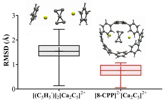 Boxplot of RMSD fluctuation of ab initio BOMD simulations for [(C5H5−)]2[Ca2C5]2+ and [8-CPP]2−[Ca2C5]2+ systems.