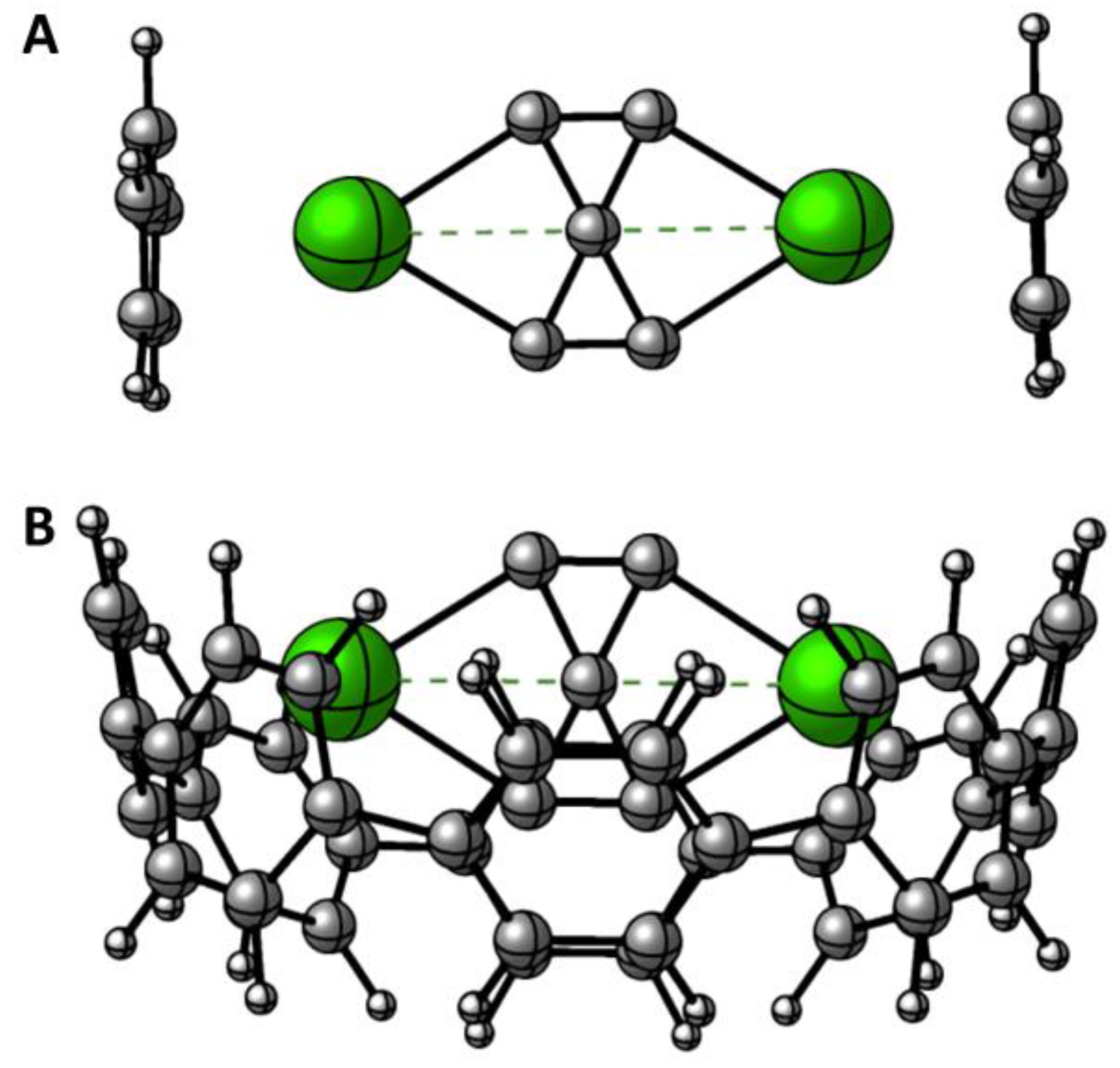 Using ligands to protect is a common technique to provide stability and viability to atomic clusters [19,64,65]. Thus, computational studies on clusters that include protection models have also been increasing, including some clusters with hypercoordinate atoms [66,67,68]. However, these studies do not analyze the relative stability of the different lower-energy isomers confined within these protective ligands. Here, we have evaluated how the relative stability of the sandwich complexes of the more stable isomers changes. We have employed as ligands the aromatic rings benzene (C6H6) and cyclopentadienyl anion (C5H5−). The former forms a sandwich with the neutral species, and the latter with the dicationic species, to have neutral complexes in all cases. The results are reported in Figures S4–S14. The use of ligands affects the relative energies; however, in no case is the phC structure preferred. The most striking case is the [(C5H5−)]2[Ca2C5]2+ system, where the complex containing the phC (Figure 3) is now within 8.0 kcal·mol–1 of the one that includes the putative global minimum. The barrier is reduced by half (relative to the isolated clusters, Figure 2) because of the C5H5− effect. This indicates that ligands should be explored in their protective role and in providing thermodynamic stability to the systems, as well.