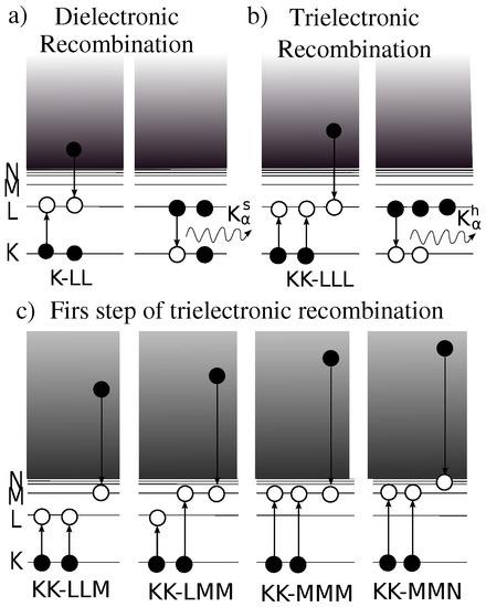 - Beilmann, C.; Postavaru, O.; Arntzen, L.H.; Ginzel, R.; Keitel, C.H.; Mäckel, V.; Mokler, P.H.; Simon, M.C.; Tawara, H.; Tupitsyn, I.I.; et al. Intershell trielectronic recombination with K-shell excitation in Kr30+. Phys. Rev. A 2009, 80, 050702. [Google Scholar] [CrossRef]