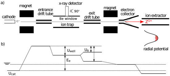 (a) Schematic of the Model S EBIT (DREEBIT). (b) Representation of all voltages at each electron beam stage.