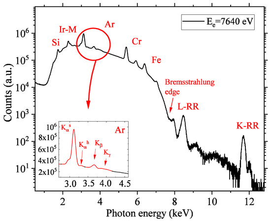 A typical time-integrated X-ray spectrum collected by the detector is shown in Figure 3 (time-resolved spectrum is shown in Section 3.2). As seen in the spectrum, several characteristic emission lines from elements present in the cathode (Ir) and physical materials of the experimental apparatus (Cr, Fe, Ni-components of stainless steel) are seen. Most prominent characteristic X-ray lines, in particular from singly-ionized Si detector atoms and stainless steel components, were used for X-ray energy calibration. The characteristic target Ar X-rays necessarily sit on top of an X-ray continuum background generated principally by the electron–nucleus interaction (bremsstrahlung [33]) of the electron beam with the edge at the electron beam energy ( = 7640 eV for Figure 3). This significant intensity of the bremsstrahlung is mainly caused by the electrons lost from the electron beam which interact with the drift tubes. During the experiment, the fraction of lost beam was kept below .The procedure of background subtraction is explained in detail in Section 3.4.