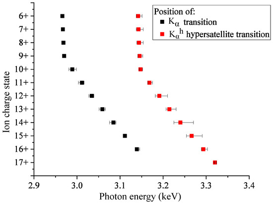 The experimental approach applied within this work is based on the analysis of the hypersatellite K transition. Results of the calculations of the corresponding transition energies are shown in Figure 5. The position of the K energy varies similarly to that for K, with the K energy generally significantly higher than the K energy. In the case of the highest ion charge states (higher than ), the K energy exceeds 3.2 keV. However, for ion charge states lower than this energy is very close to the transition energy of high-charge states (in particular to K of Ar). Based on the calculations shown in Figure 5, it has been concluded that