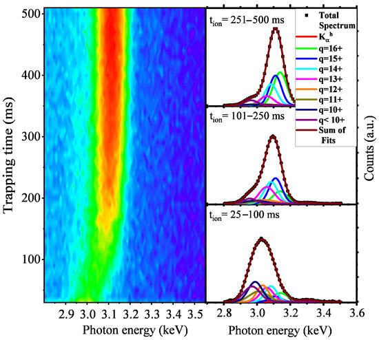 Data collection for = 6440 eV and an Ar gas pressure of mbar. Here, the charge-state-dependent K-line intensity evolution is presented as a function of trapping time (t). The plots on the right correspond to K accumulated spectra for various time windows.