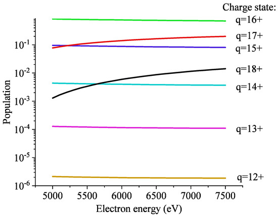where represents the population of a charge state q, was estimated based on the Ar gas pressure in the trap, denotes the cross section of an ionizing or recombination process, and and represent the electron density and velocity, respectively. These equations take into account collisional ionization (CI), excitation and subsequent autoionization (EA), radiative recombination (RR) and charge exchange (CX) with the background residual gas. The presented simulations were previously benchmarked by modeling a time-dependant X-ray spectrum of highly charged Fe ions [35].