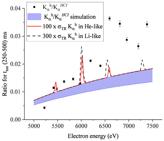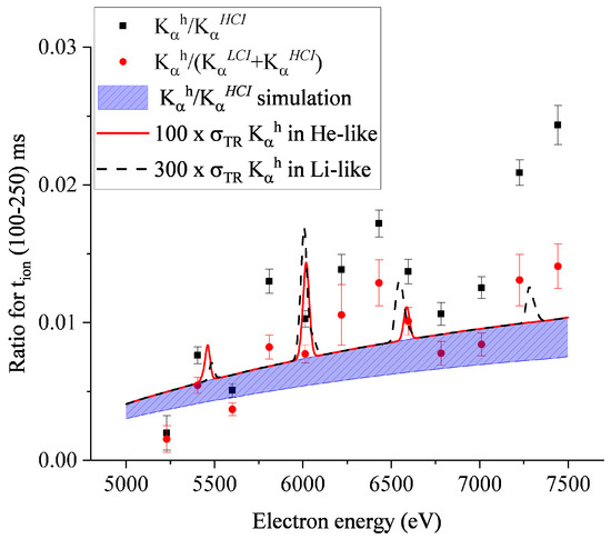 Similarly to Figure 8 and Figure 9, the experimental data shown in Figure 10 present the enhancement of the production at positions expected for KK → LLL, KK → LLM, KK → LMM and KK → MMN TR resonances. Again, the strongest enhancement of the production is seen for around 6500 eV (Figure 10). The enhancement factor between the experimental intensity ratio and the simulated background level is about . These results support the conclusion that TR resonances can be responsible for the structures observed in Figure 8, Figure 9 and Figure 10. It is noted that the position of the strongest enhancement of the intensity ratio in Figure 10 is slightly shifted to a higher value by about 150 eV if compared to Figure 9. However, for the strongest KK → LMM resonance, it is still in the electron energy range where it is expected to play a crucial role. Nevertheless, the position shift can be explained by a stronger contribution of KK → LMM TR in He-like than Li-like ions (see Figure 4). As already mentioned above, this change in charge state distribution was expected due to the application of a lower gas pressure and of a longer trapping time (Figure 6).