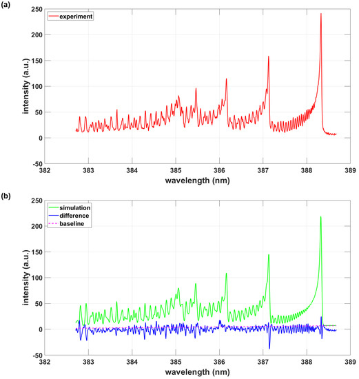 (a) Experimental spectrum; (b) simulation with PGOPHER, T = 8103 K, .