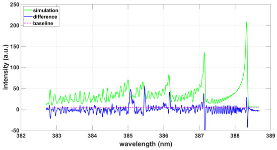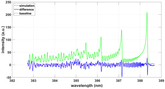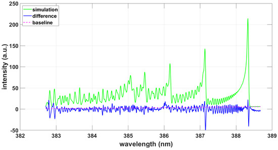 Fitting the ExoMol data using the NMT program yields a temperature of T = 9090 K for a spectral resolution of . Figure 8 illustrates the simulated spectrum, difference and baseline.