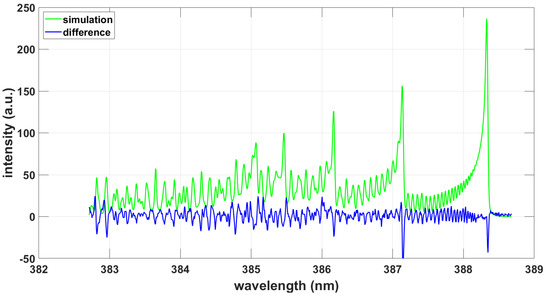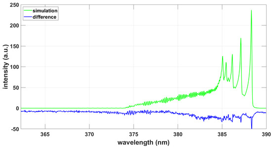Following a separate fit for determination of the wavenumber offset of 0.13 cm (0.002 nm), the selected parameters included Gaussian width, temperature, and scaling. Figure 6 illustrates the results obtained by employing the PGOPHER fitting program and the available full CN B-X and CN A-X data set [32]. The effect of the CN A-X transition lines is minimal for temperature inference, viz., 0.1% for the higher spectral resolution data (see Figure 2).