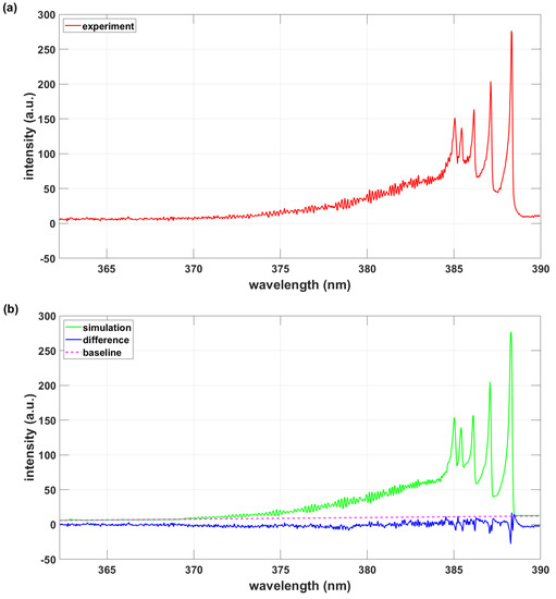 The application of traditional molecular constants (see Table 1) is expected to reveal line-position and intensity inconsistencies. For example, air emission spectra predictions with the NEQAIR code [24,25] reveal slightly different line positions leading to difficulties in air–plasma analysis of superposition spectra composed of several species. The laser plasma that is generated in dry air shows a variety of species [26,27,28]; consequently, accurate predictions of individual components are desirable. Commercial SPECAIR software is available that focuses on calculating emission or absorption spectra of air plasma radiation [29]. Conversely, one can utilize published molecular line positions and strengths for individual species for the spectra simulation of the CN diatomic molecule, as further elaborated in Section 2.2, Section 2.3 and Section 2.4.