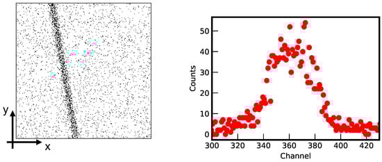 Six spectra are considered in the present article—one per ion type per spectrometer (referred here as inner and outer, indicating their position with respect to the storage ring). Each spectrum is obtained by several hours of data acquisition on the X-ray CCDs of the two spectrometers resulting in images such as in Figure 1 (left), here relative to a He-like uranium intrashell transition. The corresponding slope correction and projection on the dispersion axis is presented in Figure 1 (right). The characteristics of the spectral line depends on the natural width of the transition and the setup of the experiment. In addition to the general photon energy shift, the relativistic Doppler effect determines the spectral line slope due to the extension of the diffracting crystal, which corresponds to different observation angles around . Additionally, the line broadening along the dispersion axis is mainly caused by the Doppler effect and the size of the ion–target crossing region. This crossing region is determined by the intersection of the gaseous target, cylindrical with a uniform density, and the stored ion beam, with a Gaussian density distribution [17,18]. Because of the different ion velocities and beam preparations, line profiles from different ion species are expected to be different from each other, but similar between spectrometers. To simplify the analysis, the six spectra are considered to be independent of each other. Moreover, for the present article on the model selection of spectral lines, no particular prior assumption on the type of profile is made.