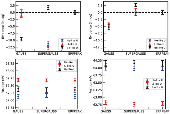 The different values of the logarithm of the evidence are presented in Figure 2 for the inner (top-left) and the outer spectrometer (top-right) and for the different intrashell transitions. The profile ERFPEAK has been taken as an arbitrary reference; only the evidence difference with respect to it is displayed. The super-Gaussian profile is favoured for most of the datasets, but not for the He-like and Li-like data of the inner spectrometer. For this reason, it has to be excluded in favour of the ERFPEAK profile which is the most or second most probable model in all datasets. Please note that a difference of 2 and 11 in the log value of the evidence corresponds to 2.5 and 5 standard deviations and a p-value of 1% and in favour of the model with higher evidence. (A correspondence between evidence differences, sigmas and p-values can be found in [25,26]). ERFPEAK is indeed the most likely profile a priori, which reflects the nature of the X-ray source obtained by the crossing of a Gaussian ion beam with a uniform cylindrical gas jet target [17,18]. As visible in Figure 2 (bottom), all the considered models provide consistent line positions with each other, within the statistical uncertainties. Please note that a more rigorous analysis would consist of considering spectra pair from the two spectrometers at the same time for each transition. Because of the linearity of the problem, adding (in log) the single demonstrates that a similar analysis can be obtained, where the spectral line widths are considered independent, which confirms our conclusions. The use of a common profile width parameter should, in principle, enhance even more the contrast between the different profile choices.