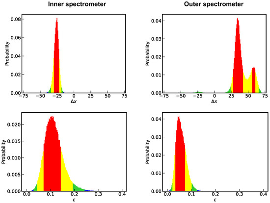Probability distributions of the satellite line position (top) and amplitude (bottom) for the inner (left) and outer spectrometer (right) for the He-like line (Figure 1). Different colours correspond to one (red), two (yellow) and three (green) standard deviations intervals.