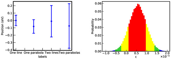 The almost point-like nature of the photon source and the spatial extension of the spectrometer position-sensitive detector generally determines the curved spectral [27,28]. However, if the source–detector path distance is large enough with respect to the detector extension, spectral lines can be considered to be straight lines. The use of lines or parabolas instead of straight lines can be directly investigated via Bayesian evidence evaluation. For this purpose, two choices of are considered in functions in Equations (3) and (5): or by . Li-like uranium spectra are exclusively considered for this type of analysis because their signal-to-background ratio is considerably higher than for the other spectra. Parabolic models systematically have a lower value of than linear models (in log), which correspond to the very small p-value of and 4.8 standard deviations. Just as for the satellite lines, the position of the spectral component does not change significantly, but the associated uncertainty is deteriorated due to the higher number of model parameters (see Figure 4, left). Moreover, as shown in Figure 4 (right), the value of the additional parameter c is compatible with a null value (within two standard deviations). This indicates the poor sensitivity to such a parameter with the present experimental data. For the above reasons, a description with straight lines instead of parabolas is well justified, without the danger of introducing undesirable systematic effects.