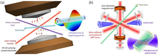 - Margolis, H.S. Trapped ion optical clocks. Eur. Phys. J. Spec. Top. 2009, 172, 97–107. [Google Scholar] [CrossRef]