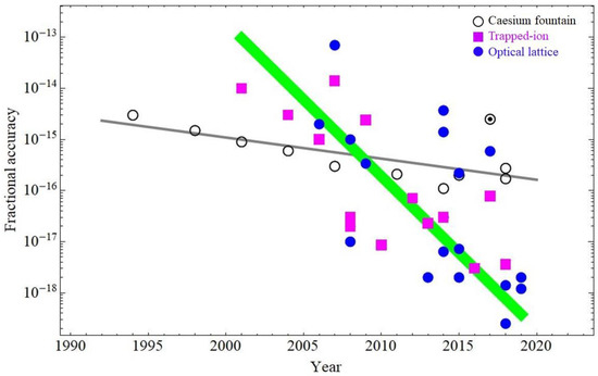 The status of the optical clock’s accuracy over the last two decades based on single trapped ions and neutral atoms in optical lattices is shown in Figure 2. The clock’s accuracy has shown significant improvement by five orders of magnitude since the beginning, reaching a few parts in 1018 level of accuracy. The scope of such ultraprecise clocks is no longer limited to lab-level experiments; advanced countries are rapidly adopting long-distance and even intercontinental networking among optical clocks. A highly sophisticated two-way fiber optic time transfer (TWFOTT) technique that uses phase-stabilised optical fibers to transport photons, conserving their phases over very long distances, is used for direct intercomparison of the geographically distributed optical clocks with extremely high precision compared with the MW or normal optical communication techniques. Some such examples of TWFOTT networks belong to (i) the European Association of National Metrology Institutes (EURAMET) among participating EU agencies, (ii) NIST ↔ Univ. of Boulder in the USA, (iii) INRIM ↔ LENS in Italy, (iv) LPL ↔ Reims in France, (v) MPQ ↔ PTB in Germany, (vi) Vrije Univ. ↔ Univ. Groningen in Netherlands, (vii) NICT ↔ Univ. Tokyo in Japan, (viii) Univ. Malta ↔ Univ. Sicily in Italy (submarine link), and (ix) an urban fiber link in China (through the desert). Here, the symbol ↔ stands for bidirectional coupling to establish the TWFOTT. The Robust Optical Clocks for International Timescale (ROCIT) in Europe is an established network for time and frequency metrology with unprecedented accuracy, whereas TWFOTT links enable the countries mentioned above to intercompare their optical clocks in a selective manner at the highest level of accuracy, even up to 10−19. Such a facility leads to the pursuance of high-end fundamental science research, such as possible extensions of the standard model (SM) by probing the temporal constancy of the dimensionless fundamental constants and searching for violations of fundamental symmetries, testing the general theory of relativity, mapping time-dependent geodetic changes, the establishment of data for vertical height measurement systems and enabling accurate levelling, searching for underground resources, and many more applications. On the other hand, these highly stabilised optical links can also be used to apply quantum technologies such as quantum communication, quantum internet, testing quantum hypotheses, etc. Beyond interlaboratory intercomparison of ultrahigh-accuracy optical clocks, many applications require transporting the “reference” photons to a remote location; these applications include carrying out chronometric levelling-based geodesy, searching for oil/natural gas, VLBI, optical frequency calibration, space applications, and many more.
