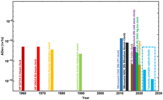 Figure 3 highlights the performance of some commonly used commercial atomic clocks. Starting with the development of Cs and Rb beam/vapour clocks during the 1960s and hydrogen maser during the 1980s, portable atomic clocks received a significant boost from the NIST-DARPA program in the USA in 2005 with the development of the chip-scale atomic clock (CSAC). Commercial CSACs were launched in 2011, soon followed by the Rb-based miniature atomic clock (MAC). Around 2015 the first commercial cold atom-based portable optical atomic clock was launched by a French spin-off from the Institut d’Optique d’Aquitaine. During the same period, a wide range of “out-of-the-lab” applications motivated miniaturisation of the associated technologies to develop a mobile/transportable compact optical clock to replace the current RF standards. A transportable Sr lattice clock is already operational at PTB in Germany [100], whereas several other laboratories are developing such portable clock systems using different species; some such examples include Al-ion clocks in Germany [101], Sr lattice clocks in Italy [102], Germany [103], Japan [104], and the UK [105,106], Yb-ion clocks in France [107], Ca-ion clocks in China [108], Hg-ion clocks in the USA [109], and Yb-atom clocks in the USA [110]. A detailed review of the present status of transportable optical clocks and projected goals can be found elsewhere [111]. Some of the manufacturers of these in-house developed transportable clocks are now partnering with industries and other agencies to make them commercially available, which is mostly part of their national quantum missions since an accurate clock is one of the indispensable prerequisites for the working of multiple quantum-enabled technologies. For example, Germany’s opticlock is one such effort that will be packaged within two standard 19-inch racks and is expected to be available soon [112]. Some other similar efforts are the iqClock from the European quantum flagship program [113], SLATE from the UK Quantum Technology Hub [114], and similar efforts from the USA.