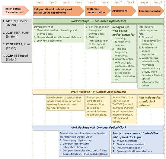The present national scenario towards the indigenisation of optical clocks and related technologies clearly shows significant voids in the areas of (i) lab-based optical clocks, (ii) optical clock networks, and (iii) portable optical clock developments, relative to their advancements in pioneering countries such as the USA, EU countries, Canada, Japan, and China (Table 1). Considering their enormous potential in quantum-enabled technologies and due to their broad strategic scope and applicability, with a possibility of sanctioning export control on some, if not all, of these critical technologies, India must champion the efforts for their indigenisation. Keeping this vision in perspective, in Figure 4, we provide a realistic 10-year roadmap, divided into three major work packages (WPs), so that India can become competitive at the international level. Over the next decade, we need to mainly focus on (i) developing ready-to-use “lab-based” optical clocks; (ii) establishing a pan-India optical clock network that connects NPL, IISER Pune, IUCAA, and IIT Tirupati, and possibly extend to ISRO and other timekeeping labs via TWFOTT; and (iii) developing ready-to-use compact out-of-the-lab optical clocks (mobile/transportable optical clocks). Detailed subsets under these three WPs and year-wise work plans associated with each of the WPs are given in Figure 3. The timescale associated with each stage was calculated based on development time starting from scratch, and the typical lead time needed to make the raw materials available despite various constraints in the country. Collaboration among the participating institutes and industry associations is necessary for the successful accomplishment of these works, and could even boost the projected timeline. The formation of a national consortium focussed on the development of optical clocks and related technology would be helpful for the execution and dissemination of the technology and the knowledge behind it in the future.